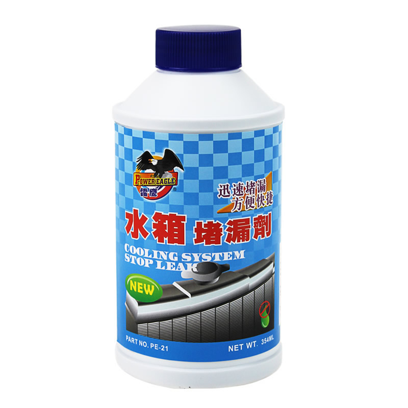 型号:PE-21 容量:354ml 包装:24支/箱 水箱止漏剂特性: 本本品能快速制止冷却系统中的水箱、散热片、膨胀塞等部件裂缝小孔的泄漏,可预防漏洞进一步扩大,密封性持久。同时也能润